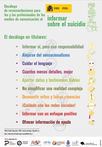 Tal y como indica el manual, aunque es evidente la buena intención y profesionalidad de las recomendaciones publicadas hasta la fecha, es necesario conocer que las nuevas recomendaciones de la OMS y de los y las profesionales de salud expertos en la materia indican que el silencio informativo no es la opción ante este grave problema de salud pública, definido así por la OMS. Para cambiar esta situación y normalizar los nuevos criterios informativos con respecto al suicidio, el texto recoge una serie de aspectos que deben ser tenidos en cuenta y que son fundamentales para informar con rigor sobre el suicidio, tales como la elección de las fuentes y el seguimiento de las recomendaciones internacionales en el tratamiento informativo de la pieza (noticia, entrevista, reportaje, etc.) con especial atención a la elección de los testimonios. Sensibilizar a la población en general a través de los medios de comunicación para que puedan reconocer las primeras señales de ideación suicida en sus entornos más cercanos, mejorar la información y concienciar a través de acciones promovidas por instituciones públicas, medios de comunicación y entidades sociales dedicadas a la causa, combatir mitos con el fin de eliminar las creencias equivocadas en torno al suicidio, contar con testimonios en primera persona que hayan pasado por esta situación en aras de sensibilizar de un modo más eficaz sobre esta problemática, ofrecer toda la información de servicio de la que se disponga y los mecanismos que existan para prevenir el suicidio (servicios de información o atención de cada comunidad autónoma y entidades sociales), o sensibilizar a los y las profesionales de los medios de comunicación ante el tratamiento de las noticias relacionadas con el suicidio para que sigan las recomendaciones Internacionales, son algunas de las acciones recomendadas que se pueden llevar a cabo desde los medios de comunicación para prevenir el suicidio. A lo largo del texto se exponen orientaciones y ejemplos de lo que debe y no debe hacerse a la hora de informar sobre esta problemático, como, por ejemplo, no tratar la muerte por suicidio de forma sensacionalista, ser prudente en el uso de imágenes, no glorificar a la persona que se ha suicidado, ni presentar la muerte como una solución a sus problemas, sí referirse a las muertes por suicidio como un hecho no como un logro, resaltar las alternativas al suicidio, aportar información sobre factores protectores, de riesgo y señales de alarma, ofrecer un mensaje de solidaridad a los supervivientes en momentos de profundo dolor, proporcionando datos de contacto (webs) de los grupos de apoyo para supervivientes, etc. Para acceder al manual pincha el siguiente enlace: Recomendaciones para el tratamiento de suicidio en los medios de comunicación | ||||