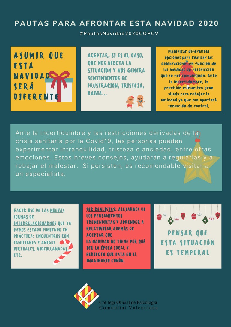 A pesar de que las diferentes administraciones ya han hecho públicas las restricciones y medidas de seguridad que tendremos que cumplir esta Navidad, son muchas las personas que se muestran contrariadas, tristes o nerviosas. Como psicólogos y psicólogas, sabemos que todas estas emociones son completamente normales y que hay dejarlas salir ya que forman parte del proceso de autorregulación del ser humano ante el contexto de pandemia que estamos viviendo. Las vicedecanas del COPCV, Concepción Sánchez Beltrán y Mar Lluch, ofrecen varias pautas para hacer frente a esta atípica Navidad de la mejor manera posible. Ambas coinciden en que es fundamental aceptar, si este es el caso, que la situación no es de nuestro agrado y que nos genera sentimientos de tristeza o rabia, por ejemplo, ya que las personas estamos programadas para generar reacciones emocionales ante los estímulos. Por eso, continúa Lluch, tratar de que no nos afecte una situación que no nos gusta, es marcarse un objetivo frustrante. Por otra parte, y a pesar de vivir en un contexto que no hemos elegido, todavía podemos tomar ciertas decisiones y planificar ante diferentes escenarios posibles. Esta previsión es clave para aportarnos sensación de control, de libertad e independencia, afirma Lluch. Sánchez Beltrán hace hincapié en seguir usando las redes sociales y las plataformas existentes para sentir a amigos y familiares más cerca. | |||