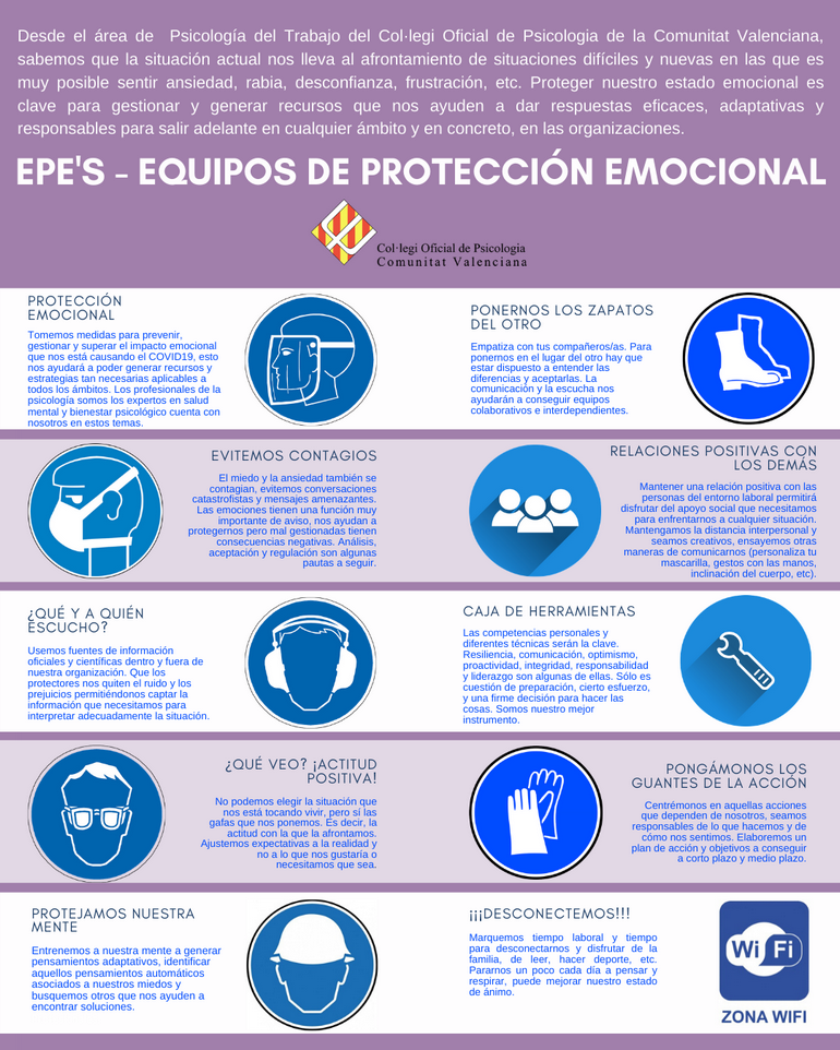 Una vez iniciado el proceso de desescalada, uno de los retos clave en las organizaciones es el de generar confianza desde la incertidumbre. Las personas, para poder ponerse en marcha, generar ideas, colaborar y mostrar sus mayores niveles de eficacia y compromiso, necesitan tener elementos que les ayuden a adaptarse a la situación vigente y sentir la confianza suficiente para superar las dificultades. Al igual que para proteger la salud física contamos con los Equipos de Protección Individual-EPI´S, desde el COP Comunitat Valenciana, con la colaboración de los coordinadores y coordinadoras de los grupos de trabajo de la vocalía de Psicología del Trabajo, hemos elaborado los EPE´S – Equipos de Protección Emocional orientados a generar espacios de seguridad emocional en la organización posibilitando así, la mejor adaptación y recuperación en las diferentes fases de desescalada. | |||
