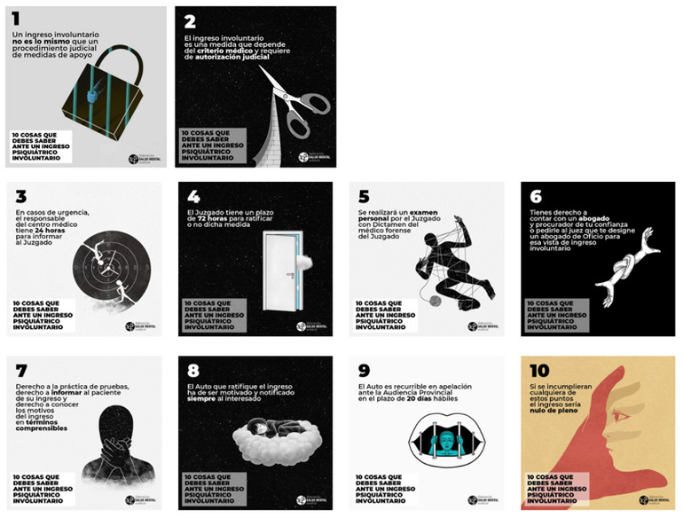 Muchos eran los casos que llegaban a la Oficina de la Defensa de la Federación donde, por parte de las personas usuarias, se narraban experiencias especialmente traumáticas en el marco de los ingresos involuntarios, ante la utilización de contenciones, suministración farmacológica excesiva, ausencia de representación letrada de la persona en la vista de internamiento, en definitiva, restricciones a los derechos más elementales. Así lo ha advertido la Federación Salud Mental Madrid (organización sin ánimo de lucro que agrupa a 16 asociaciones de personas con problemas de salud mental y sus familias, para ofrecer soporte, atención y desarrollar sus programas en el ámbito de la Comunidad), para poner de relieve la trascendencia de abordar esta cuestión y emprender iniciativas para velar por la dignidad humana de este colectivo tan vulnerable. Para tal fin, considera fundamental facilitar toda la información necesaria sobre este tema, evitando así que, por desconocimiento de la normativa legal, estas personas continúen sufriendo prácticas abusivas y restrictivas de sus derechos. En este sentido, ha publicado un decálogo en forma de infografías a través del cual pretende informar sobre los derechos más vulnerados de las personas con problemas de salud mental que se enfrentan a un ingreso involuntario. | |||