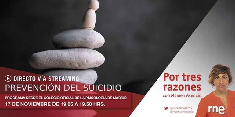 Hoy miércoles 17 de noviembre, se emitirá en directo el programa nacional Por tres razones de RNE con un monográfico sobre la prevención del Suicidio. Además, el programa se retransmitirá en directo vía Streaming por el Canal de Psicología TV y por las distintas redes sociales del Colegio y de RNE Por tres razones. Este programa se enmarca dentro de las actividades que está realizando el Colegio en el proyecto «Hablemos de…Suicidio» y que realiza durante la semana que se celebra el Día Internacional del Superviviente del Suicidio (20 de noviembre). | |||