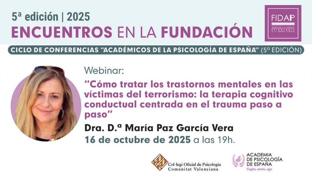 Desde la Fundación para la Investigación, Desarrollo y Aplicación de la Psicología de la Comunidad Valenciana (FIDAP), en colaboración con el COP Comunitat Valenciana y la Academia de Psicología de España, tienen el placer de invitar a todas las personas interesadas a la quinta edición de sus «Encuentros en la Fundación», un espacio dirigido, principalmente, a psicólogos/as colegiados/as y estudiantes del último curso del Grado de Psicología, durante el cual prestigiosos/as profesionales de la Psicología española comparten sus conocimientos sobre diversos ámbitos en los que son expertos/as.