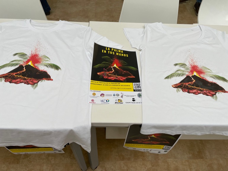 Con la colaboración de los colegios oficiales de Médicos, Enfermería, Odontólogos y Podología, así como de la Fundación Biotyc y Cáritas Albacete, se ha puesto en marcha la campaña «La Palma en tus manos», en la que también participa el Colegio Oficial de la Psicología de Castilla-La Mancha. La iniciativa parte de dos médicos de urgencias, Verónica Plaza y Pilar Amores, consistente en la venta camisetas solidarias, diseñadas por la primera de ellas, con el objetivo de ayudar a los damnificados por el volcán. El precio de las camisetas es de 20 euros, y la totalidad de esa cantidad irá destinada a Cáritas de La Palma. Los colegios profesionales participantes en la iniciativa, sufragan el coste de las camisetas para que todo el dinero recaudado llegue íntegramente a los damnificados, y Fundación Biotyc se encarga de toda la plataforma para que se puedan comprar por Internet. | |||