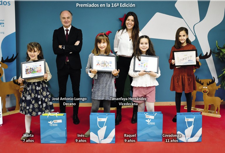 El pasado 14 de diciembre se realizó la entrega a las premiadas de la 16ª edición del Concurso de Felicitaciones de Año Nuevo 2022. El resto de los participantes, debido a la actual situación sanitaria, recogió en la sede del Colegio y de forma individual su dibujo enmarcado y su regalo, de manera escalonada durante la segunda quincena del mes de diciembre. Este concurso, organizado por el Colegio Oficial de la Psicología de Madrid, y que este año tenía como lema «Feliz 2022, un año para el Respeto y la Inclusión», tiene como objetivo premiar las felicitaciones presentadas por los hijos e hijas menores de 12 años de los colegiados y colegiadas. El concurso ha vuelto a tener una magnífica acogida y han sido muchas las obras presentadas. El acto de entrega de los cuatro dibujos premiados en cada una de las categorías, al que acudieron las niñas premiadas acompañadas de sus familiares, estuvo presidido por el Decano del Colegio José Antonio Luengo, y la Vicedecana, Timanfaya Hernándeza. | |||